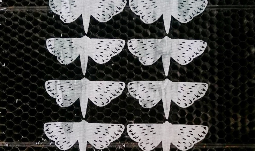 To add an even more textured feel to the moths I began printing texture from some of my watercolour mark-making onto the fabric using sumblimation printing, before cutting the moth shapes, giving them more definition.